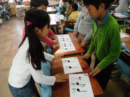グループで、リズムのカードを並べ試してしっくりくるリズムに仕上げました。