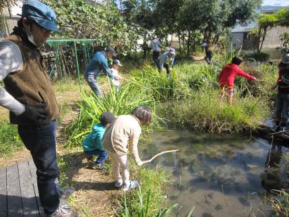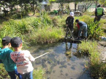 次に収獲した渋柿を干し柿にしました。学校の渡り廊下にも干しました。最後はお待ちかねのザリガニつりです。少し寒いのか,数多くはつれませんでしたが,つれた子どもたちは大喜びでした。お世話いただいたビオトープ委員会の皆さん,本当にありがとうございました。