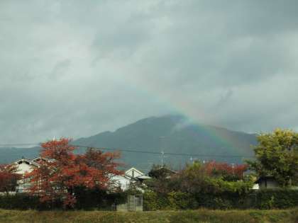 そこに、ぱらぱら雨まで降ってきて・・・と思ったら、川の向こうに大きな虹が見えました。虹を見た子どもたち、急に元気になって大騒ぎ!よく歩いたご褒美に出てきてくれたのかな?