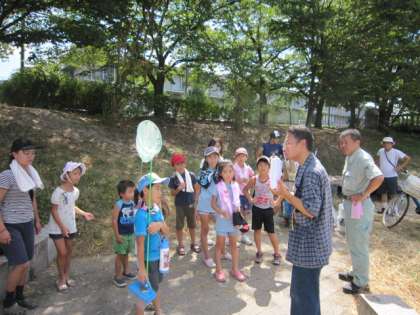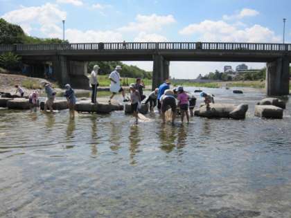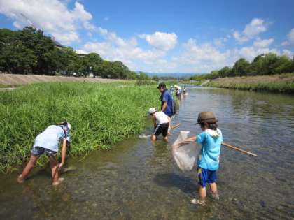 好天になり,暑すぎる日でしたが,今年も鴨川探検ができました。川の中の生き物調査,川の水質を調べました。網の使い方を教えていただき,生き物を集めに行きました。川の中でこけて濡れてもかえって気持ちが良いような日でした。石の裏,石ころをごそごそ,流れの速いところ遅いところ,草の茂っている近くなど見当をつけて探しました。