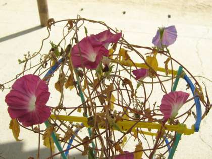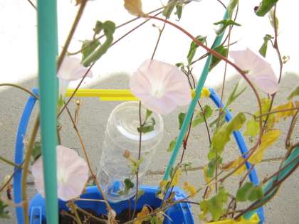 夏休みも終わり,アサガオのつるも枯れてきている様子も見られます。そんな中,まだまだ元気にきれいな色のアサガオの花を咲かせているものもあります。