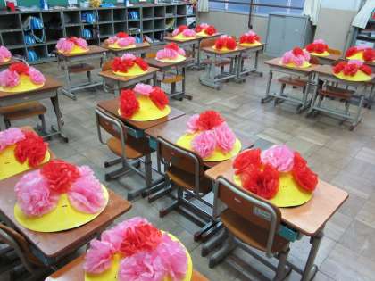 子どもたちが帰った後の教室です。今日の5時間目に,運動会で使う「花笠」を作りました。