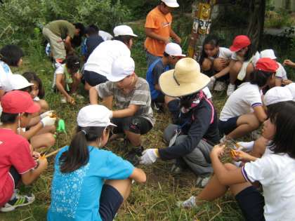 穂のついていない稲を拾って,たんぼへ戻します。