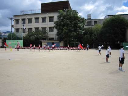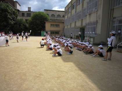 少し暑さがましになり,運動会全校練習をするようになりました。児童席も昨年と少し変えて,日陰を有効利用しようと考えています。本館北側は,日陰になりますので,利用します。