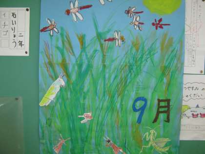 でも教室の9月の掲示物は,「そろそろ秋を」と考えて,とんぼ・すすき・虫たちを描きました。