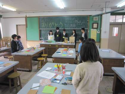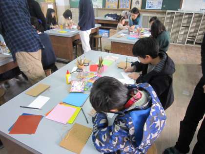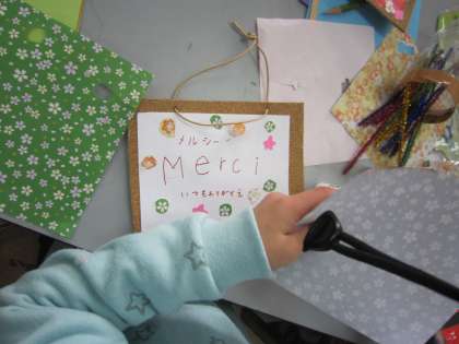 サタデースクールがありました。同志社大学の学生さんにお世話になり「感謝ボード」を作りました。画用紙に感謝の言葉を書き,コルクボードに貼り付け,飾りつけをしていきます。普段お世話になっている方に感謝の気持ちをこめて,作ることができました。