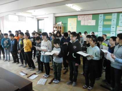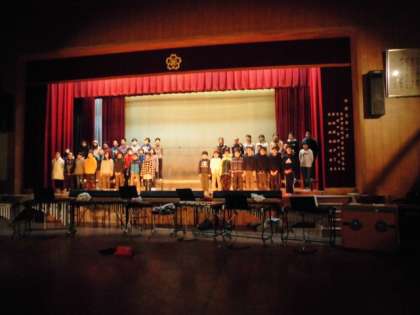 明日は学習発表会です。5年生はノンストップクラシックメドレーといきものがかりの「笑顔」を発表します。子どもたちの気迫,表情,動き,声,いろいろなところに注目していただけたらと思います。違う音,違う声を一つの音にします。ご期待ください。