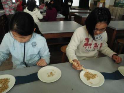 4年生ともなるとさほど苦も無く豆を運ぶ子どもたち。30秒間で20個前後の豆を運ぶことができました。