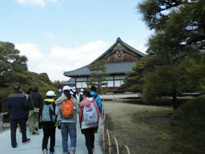 龍安寺、二条城の見学、御所でお弁当、最後に京菓子資料館で和菓子をつくる体験をしました。