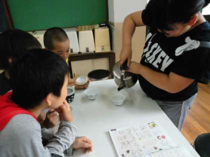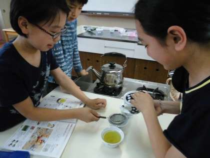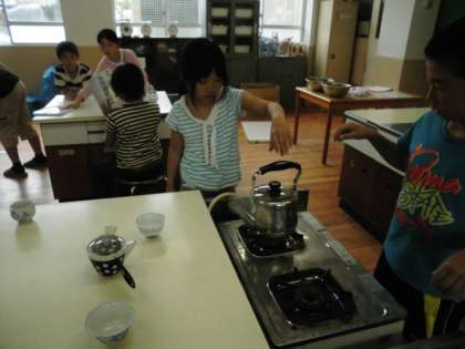 本日,家庭科でお茶を入れました。ガスの使い方を確認し,急須を使ってお茶の入れ方を学びました。ちょうどいい濃さでお茶を入れられた班,長く置きすぎて濃く少し苦いお茶になってしまった班様々でしたが,それも経験。今日学んだことをぜひおうちでも実践してほしいです。お茶を飲んだあとの子どもたちの「ホッ」とした顔がとても印象的でした。