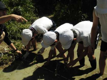 本日,1・2時間目に待ちに待った田植えがありました。いつも来ていている京都大学大学院の先生に植え方を教わりながら,一つずつ丁寧に植えていきました。コツをつかむと,植える姿は様になっていました。来てくださった先生も「本当に上手」とびっくりされていたほどでした。普段できない体験ができて子どもたちはとても楽しそうに作業をしていました。せっかくきれいに植えた稲。ここからが本番。枯らしたり,病気になったり,雀に食べられたりしないように,日々の観察頑張っていきましょう!