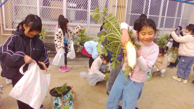 抜いて初めて目にする自分の大根の姿に、歓声と「先生見て!!」の大合唱でした。