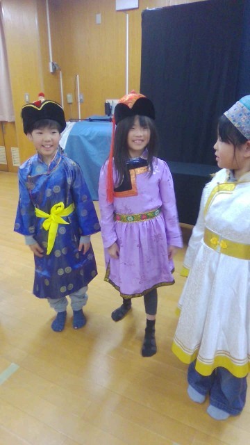 馬頭琴を鳴らして興奮したり、伝統衣装を着てうきうきしたり、モンゴルの遊びを楽しんだり、ゲルの模型に驚いたり・・・たっくさんの体験をさせていただきました。