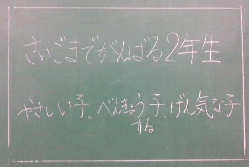 子どもたちが“どんな2年生になりたいのか”について話し合いを重ねた結果、学年目標は「さいごまでがんばる2年生 ~やさしい子、べんきょうする子、げん気な子~」に決まりました。