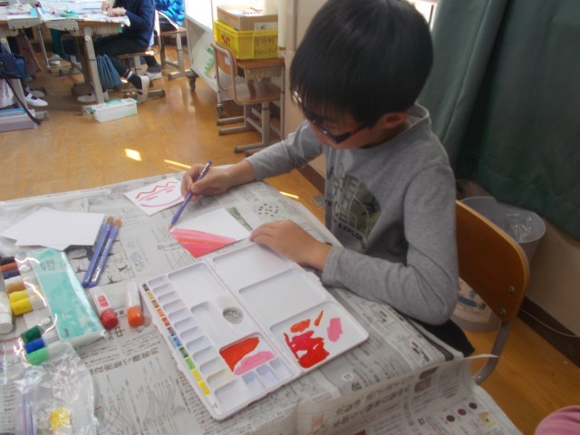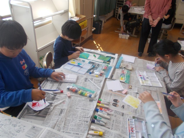 図画工作科で『心のもよう』という学習を行いました。気持ちを表す「色」や「形」に着目し、さまざまな方法を試しながら作品づくりに取り組みました。