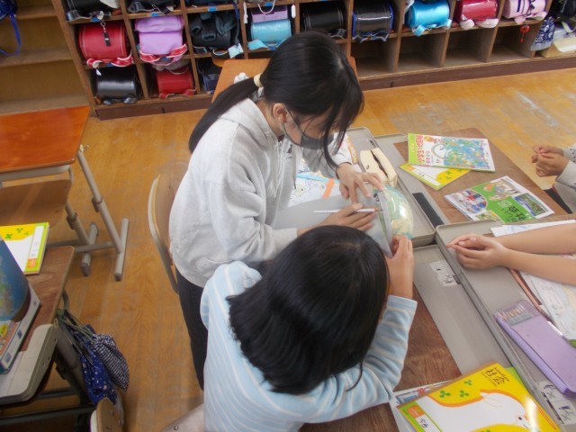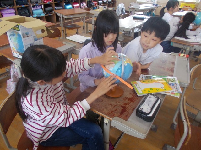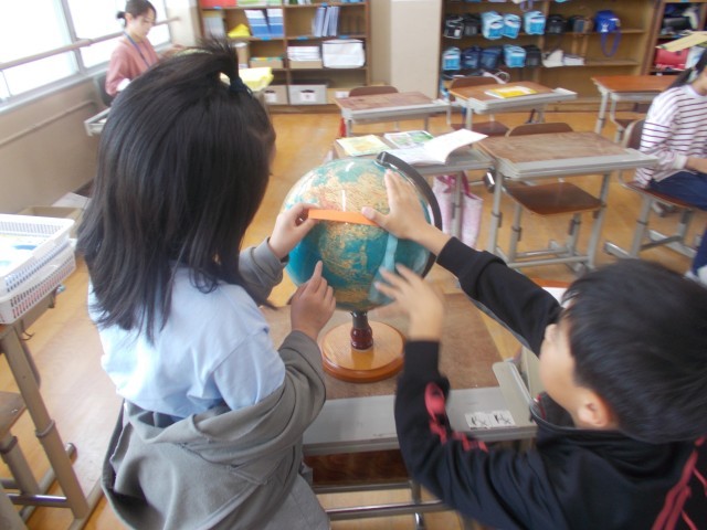 社会科の学習で、地球儀と地図帳を使いながら、世界の国々について調べました。日本から真東に進むと、地図帳ではアメリカ合衆国があるように見えますが、地球儀で確かめてみると、まったく違う場所にたどり着くことに気付きました。