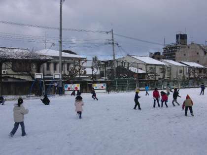 昨日からの雪が降り積もり,三条大橋近くの新洞校区でも校庭には,約4cmの積雪がありました。一面の雪景色の中です。水分が少ないパウダースノーで,とてもいい雪でしたが,雪玉には,少しなりにくかったようです。雪の多い地域の皆さんは,大変ですが,子どもたちは,みんなで雪遊びを楽しむことができました。