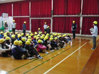 今日は,全校で避難訓練に取り組みました。地震が起きた想定で一次避難(机の下),二次避難(講堂)をしました。その後,地震が起きた時どう行動すればよいのか,みんなでビデオを見たりクイズをしたりして確かめました。
