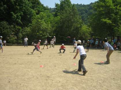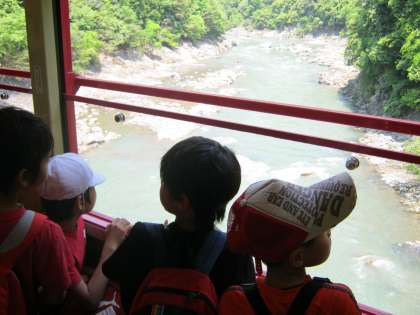 全校で縦割り遠足に行きました。京都バスで川端三条から清滝まで行き落合まで歩きました。清滝川沿いの道は風がとてもさわやかでした。落合では,少し長めの休憩を取り,川辺で生き物を探したり石で遊んだりしました。その後,トロッコ保津峡駅まで歩きました。そして,みんなが楽しみにしていたトロッコ列車に乗りました。列車からの眺めは,すごくきれいでした。亀山公園でお昼ご飯を食べた後,縦割りグループでドッチビー大会をしました。一度の延期がありましたが,いいお天気のもと行くことができました。