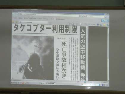 新洞小学校では,3年生からインターネットを学習の中で使っていきます。今日は,インターネットの中にも「本当かどうか分からない情報がある」ということを意識してもらうために,わざとインターネットに紹介されている間違った情報を子どもたちに示して,どのように接していけばよいか考えていきました。タケコプターで交通事故が増えているという記事を紹介したのですが,子どもの中には素直に「ほしいなあ」という声もありました。でも,「うそっぽい」「テレビでも新聞でも聞いたことがない」と情報が本当かどうかを判断していくためには,他の情報源と比較することも大切だということに気づいた意見もありました。