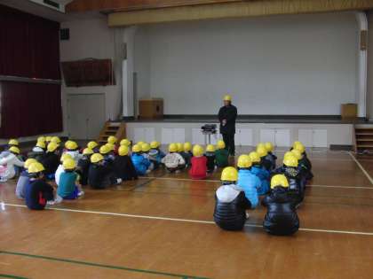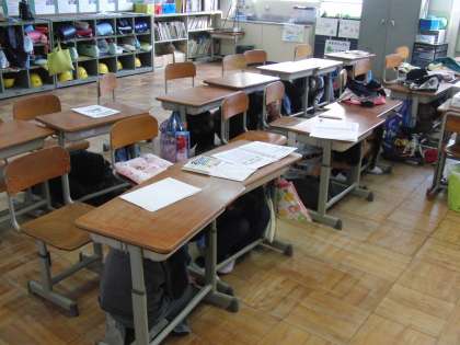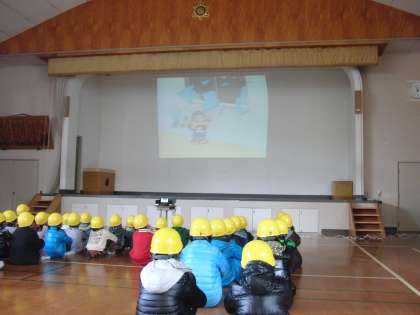 今日は,全校で避難訓練に取り組みました。地震が起きた想定で一次避難(机の下),二次避難(講堂)をしました。その後,地震が起きた時どう行動すればよいのか,「あっ地震だ。おちついて,あわてない」というアニメビデオをみんなで見ました。教室にいるとき,廊下を歩いているとき,運動場にいるときなど場面に合わせて,どのようにすればいいか学習することができました。