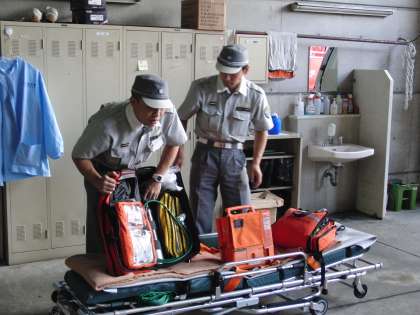 4年生が,社会の学習で新洞消防分団や消防署の方々にご協力頂き,地元の岡崎消防出張所を見学させて頂きました。救急車の中や消防車の仕組み,防火服等いろいろなことを教えて頂いたり,消防には,「消火」「救急」「防災」「火災予防」「救助」の5つの役割があることや京都市内にある消防署や消防出張所の場所や数などを教えて頂きました。救急車の出動は,昨年度,7万件以上にのぼり,7分30秒に1回になるということをお聞きしました。消防車の説明をして頂いているとき,丁度,出動要請があり,慌ただしく出動される場にも出会いました。