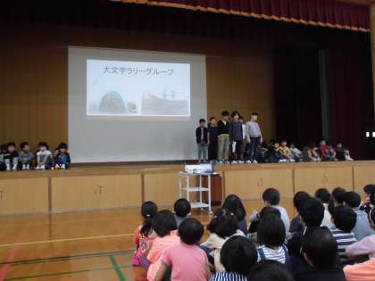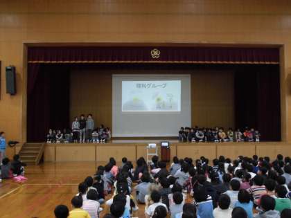 今日の1時間目に表現タイムで、それぞれのグループに分かれて運動会や学芸会など学校生活での楽しいことについて発表しました。大きな声ではっきりと全校のみんなへ伝えることができました。