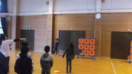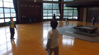 天気は雨ですが,子どもたちは元気に過ごしています。いま,外での活動ができないため,プレイホールでフリスビーターゲット,バドミントン,輪投げをしています。