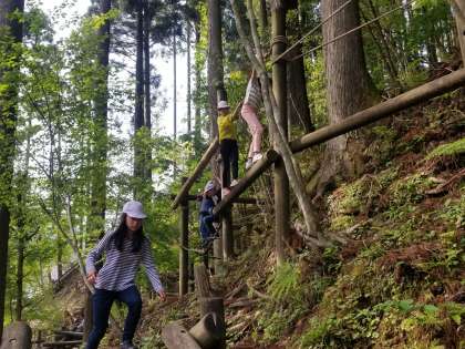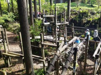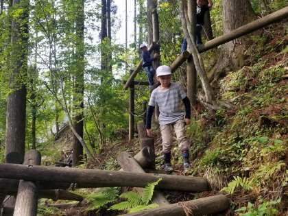 自然がいっぱいの中で行うアスレチックはなかなかハードでしたが、友達と励まし合って挑戦しました。