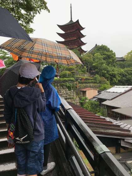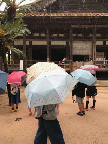 小雨が降る中、見学に出発。まずは、五重塔の見学です。雨中、ガイドさんから説明を聞く子どもたち。千畳閣下の回廊を行き、厳島神社を目指します。