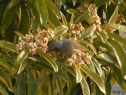 ふと横をみると,びわの木にとまってエサを食べている鳥がいました。