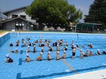 今日と明日は,低水位で水に慣れるということで,プール一周めぐりをしたり,わにさんになったり,宝探しをしたりして遊びました。