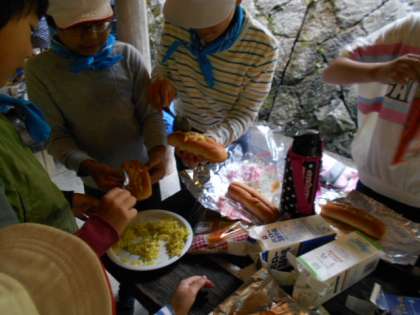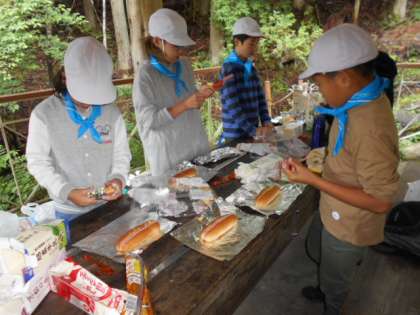 二日目の朝食は、自分たちでパックドッグを作って食べました。