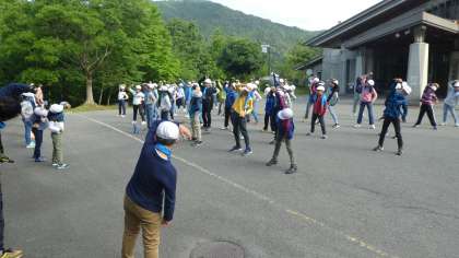 今日の目標や予定、目覚ましクイズをした後、登山をするので全校体操をしました。
