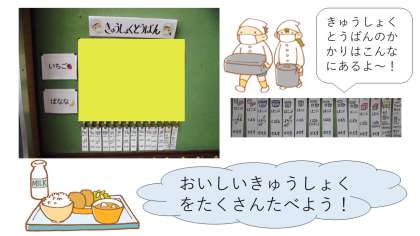 しょうがっこうには,きゅうしょくがあります。えいようまんてん,とてもおいしいですよ!