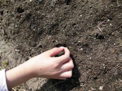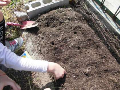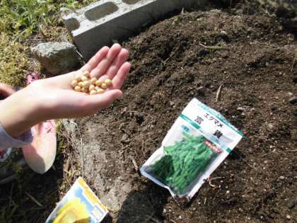 土に肥料をまぜて,指で穴を開けて種を入れていきました。