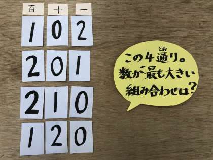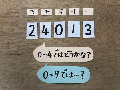 その中で「0から9までの数をすべて使って,13けた(14けた)の数を作る問題について,考え方のヒントを伝えます。