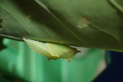 もう,さなぎになって1週間がたちます。さなぎの中から見える白いはねがますますくっきりと見えるようになってきました。また,さなぎの色も,黄緑からだんだん深い緑色になっている気がします。