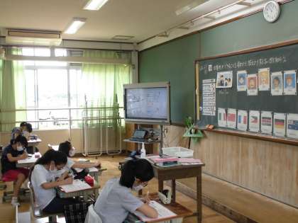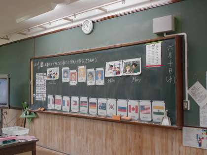 子どもたちは,5年生のときに学習した国の名前を復習しながら,相手の出身地を尋ねる表現を学習します。