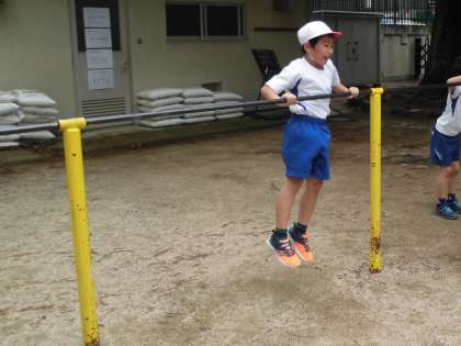 クラスを半分に分けて,交代しながら,鉄棒の学習にも取り組んでいます。