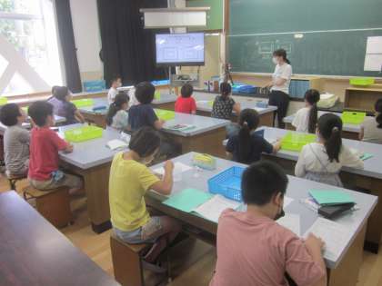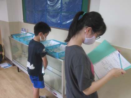 全員がそろっての学習が始まりました。密集を避けるため,廊下も使って観察をしています。