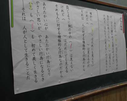 「こころ」や「思い」は見えないけれど,「心づかい」や「思いやり」になると目に見える,つまり,行動に移すことで自分の「思い」が人に見えるものになるという内容でした。