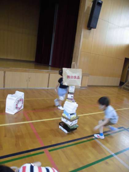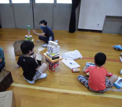 広い体育館で,家から持ってきた箱を積んだり並べたりつないだり。高い塔や自分の部屋やドミノ倒し,猫など動物を作っていました。
