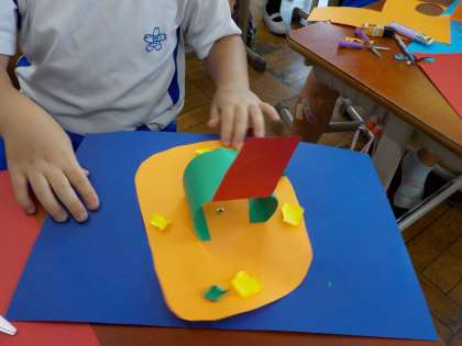 久しぶりの工作で,子どもたちはわくわくした気持ちでいっぱいでした。まずは,割ピンを使って紙を回す仕組みや,台紙の上に紙を立たせる方法などを知り,設計図を描きながら自分の作りたいものを考えました。紙が回る仕組みがうまく生かされるように,設計図を描いていました。回転寿司にバレリーナ,観覧車,コーヒーカップ,ドールハウスなど,それぞれ作りたいものを夢中で作っていました。あっという間に時間が過ぎ,「先生,これずっとやっていたい。もっと時間が欲しい。」とやる気いっぱいの子どもたちでした。
