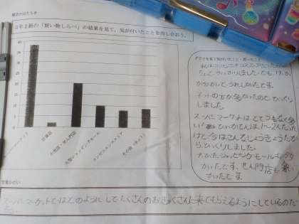 「商店のはたらき」では,「買い物調べ」のご協力ありがとうございました。調べる前の予想では,「スーパーマーケットが一番多いと思う。家に近いし,安いから。」と言っている子が多かったですが,やはり予想通り,スーパーマーケットの利用がダントツに多かったです。しかし,その結果とともに,「どうしてそんなにスーパーマーケットは人気なのかな。」という疑問も生まれました。そこで,スーパーマーケットの魅力や工夫は何か調べていくことにしました。担任が撮ってきたスーパーマーケットの写真を手掛かりに店内図を作成したり,工夫を見つけたりしています。知れば知るほど,「どうやって野菜は運ばれているのかな。」「どうやって新鮮さを保っているのかな。」「商品の値段はどうやって決めているのかな。」などと,新しい課題が次々に出てきています。