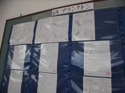 理科室前の廊下には,子どもたちがかいた観察の記録が掲示してあります。