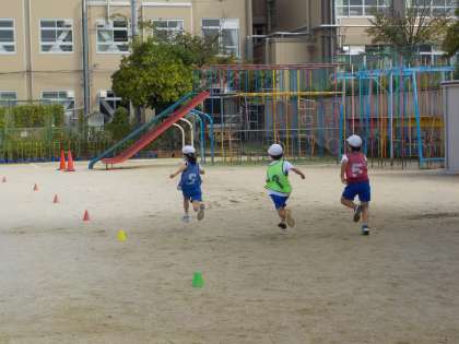 体育では,リレーをしています。直接バトンパスをするかわりに,前の人がゴールをしてタンバリンを鳴らすと次の人がスタートするというやり方でつなげています。しっかり前の人の走りを目で追い,音が聞こえるのと同時にダッシュすることが出来るようになってきています。