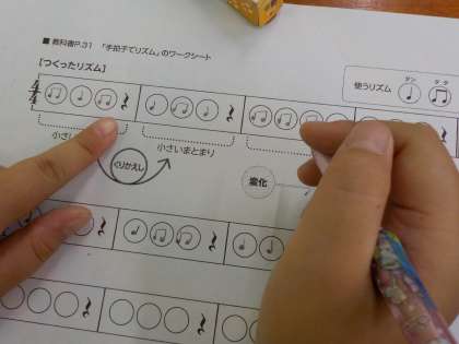 音楽では,くりかえしやまとまりを意識して,リズム作りをしています。四分音符や八分音符を使って紙に表した子どもたち。次の時間は,コンピュータ室へ行ってパソコンにリズムを打ち込み,自分の想像していたリズムと合っていたか,確かめてみたいと思います。