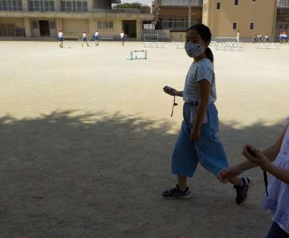 「km」の学習をして,「1km=1000m」ということが分かった子どもたち。でも,1kmってどれくらいなんだろう…といまいち感覚がつかめない様子でした。「学校の校庭の一番外側を歩いたら,道のりはどれくらいかな?」と聞いた時,「1km!」と答えた子がたくさんいました。測定器を使って測ってみると,200m弱で,びっくりしていました。「じゃあ,校庭を5周したらやっと1kmなんだね。1kmってけっこう長いんだな。」と気づけたようです。