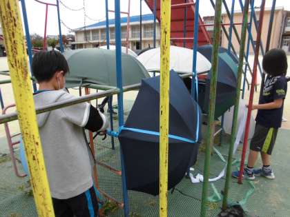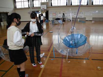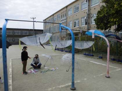 「傘を開いたとき,何も思い浮かばなかったけど,すずらんテープなどを貼ることで,どんどん想像が広がっていったのでよかったです。全部の傘を逆にしてやったので,次は傘の向きを変えてやってみたいです。」